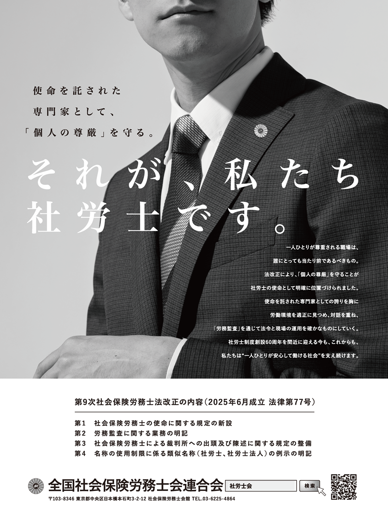 本年6月に成立した第9次社会保険労務士法改正の内容である(1)社労士の使命に関する規定の新設、(2)労務監査に関する業務の明記、(3)社労士による裁判所への出頭及び陳述に関する規定の整備、(4)名称の使用制限に係る類似名称(社労士、社労士法人)の例示の明記を載せるとともに、「個人の尊厳」を守ることが社労士の使命として明確に位置付けられたこと、「労務監査」を通じて“一人ひとりが安心して働ける社会”を支え続けることを発信しました。