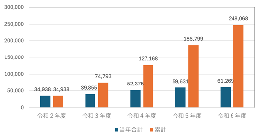 これまでに多くの学校からの依頼により、直近5年間(令和2年度から令和6年度)で全国で、約240,000人の学生・生徒に対して出前授業が実施されました。